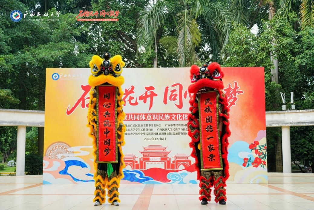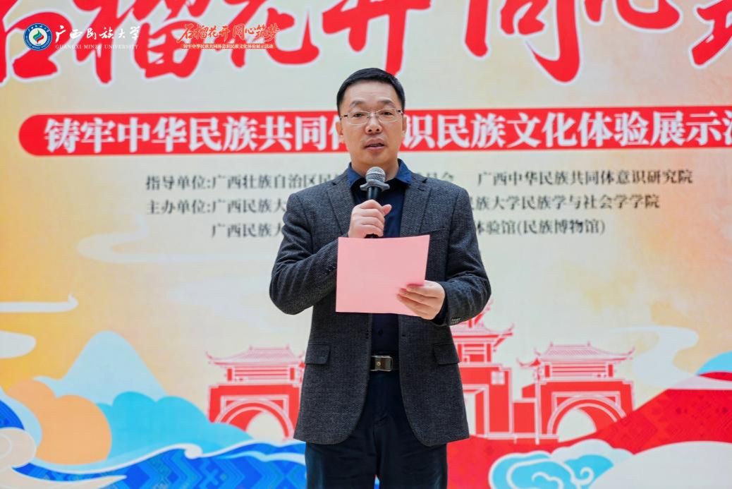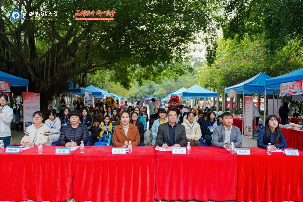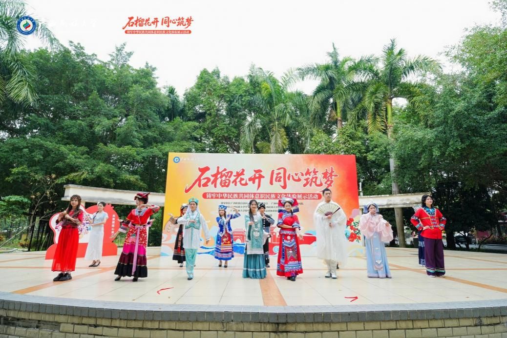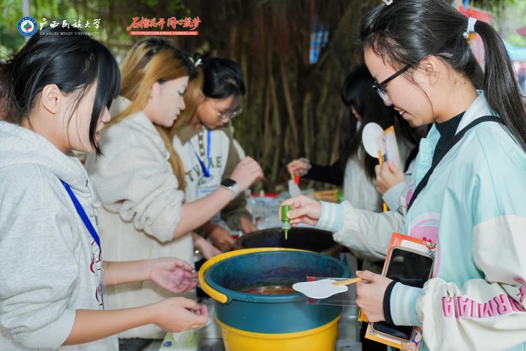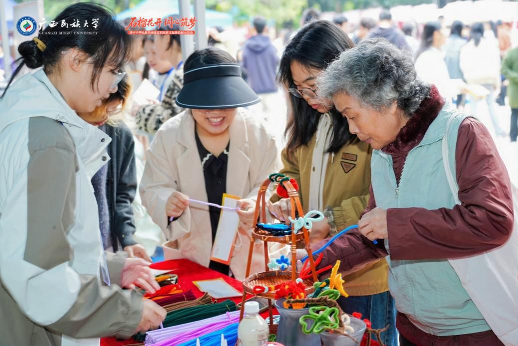为深化民族团结教育,传承民族优秀文化、彰显学校多民族汇聚办学特色,12月6日,民族学与社会学学院于相思湖校区五坡文化广场举办“石榴花开,同心筑梦”铸牢中华民族共同体意识文化体验展示活动。民社学院党委书记黄中显,党委副书记陆惠君,副院长陈锦均,隆林苗绣刺绣自治区级代表性传承人、广西工艺美术大师杨云及学院辅导员共同出席。
