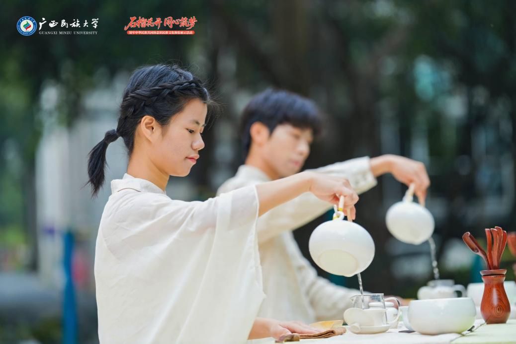 活动伊始,黄中显在致辞中强调,铸牢中华民族共同体意识是青年一代的责任与使命,并鼓励师生在体验中感悟“同心筑梦”的深远意义。随后,系列活动精彩展开,现场气氛热烈。舞狮表演以昂扬姿态拉开序幕;“民族风尚秀”与民族舞蹈相继登场,通过服饰展示与舞蹈语言,生动呈现了各民族文化的交融互鉴;书法协会、相思湖印社、格茗茶艺社与民族文化和谐促进会联合呈现节目《雅韵清茗》,融书法、篆刻、茶艺于一体,传递出团结和谐的美好祝愿。