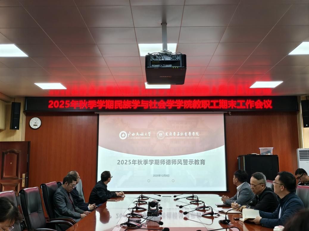 为深入贯彻落实中央及自治区关于加强教师队伍建设的决策部署,根据学校关于开展师德师风警示教育工作的统一安排,129日,民族学与社会学学院师德师风警示教育大会在基地楼103会议室召开。会议由学院党委书记黄中显主持,全体教职工参加。