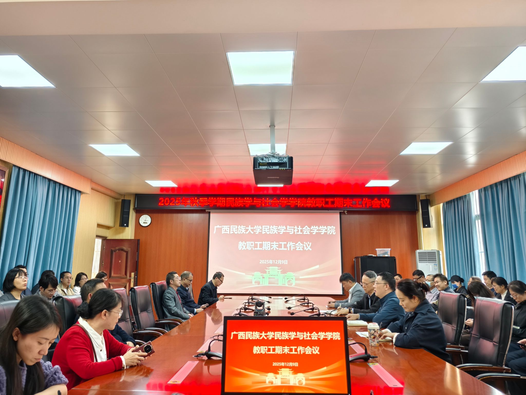 12月9日,民族学与社会学学院在基地楼103会议室召开2025-2026学年第一学期期末教职工会议。会议由学院党委书记黄中显主持,全体教职工参加。
