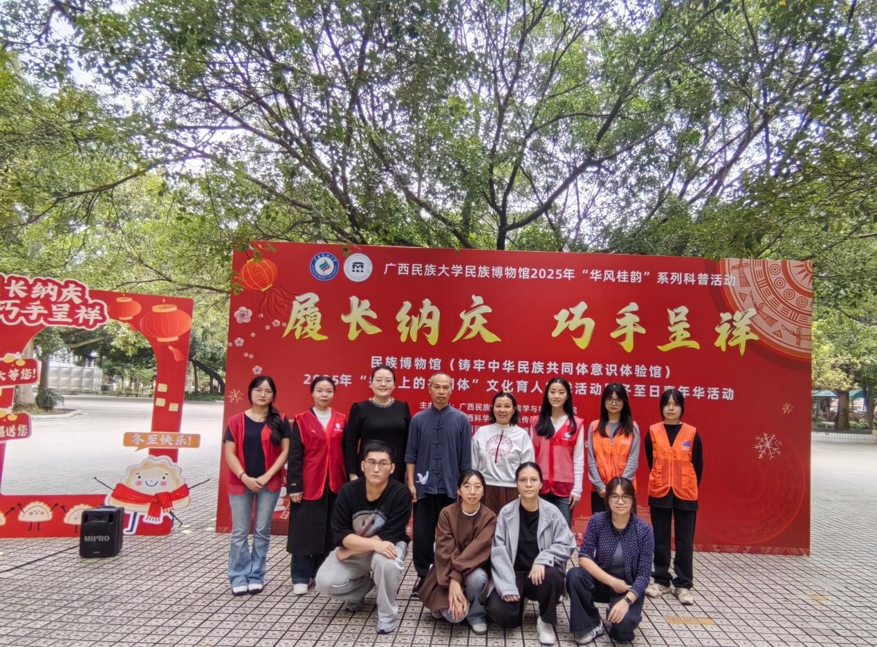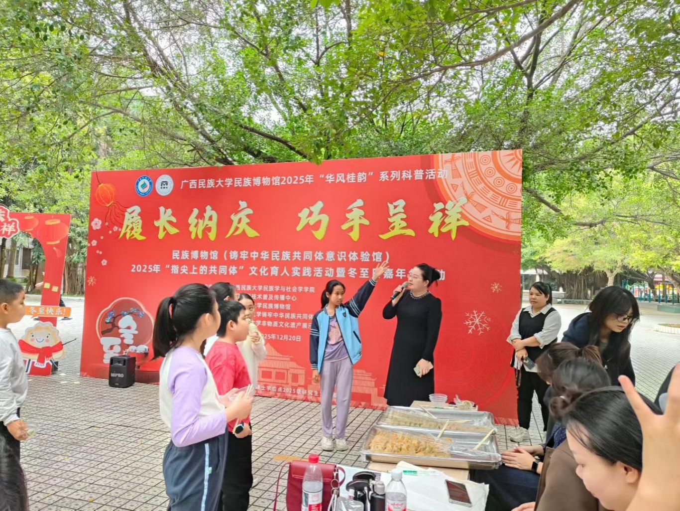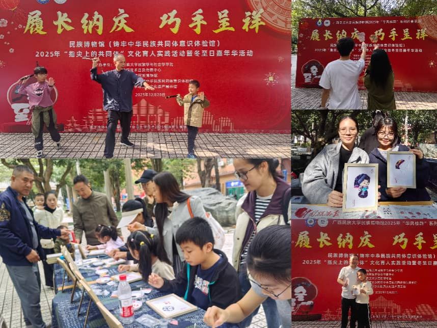 2025年12月20日上午,广西民族大学五坡文化广场上弥漫着浓郁的节日氛围与非遗气息。由我院民族博物馆(铸牢中华民族共同体意识体验馆)与广西科学技术普及传播中心联合举办的“华风桂韵”系列科普活动之“指尖上的共同体”冬至主题文化体验活动在此盛大举行。来自全校各院系的100余名师生欢聚一堂,共同迎接冬至佳节,感受中华传统节日文化的深厚底蕴。