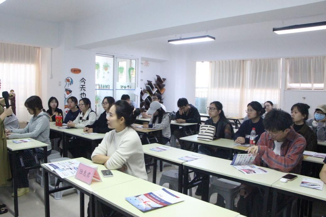 随后,师生前往23楼教室,聆听广西生涯导师卢锦燕的专题分享。卢老师通过宣传片、PPT等形式,系统介绍了广西生涯——慧未来职业发展中心与南宁市家和兴职业培训学校的发展历程、师资力量及资源优势,全面展示了两所机构的专业实力。