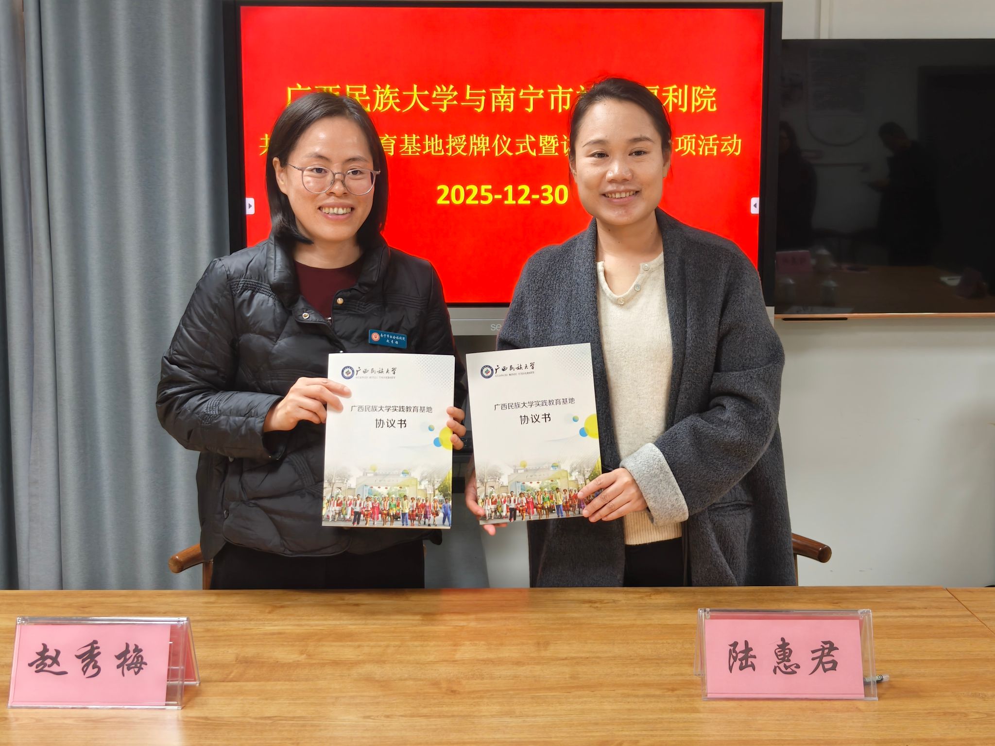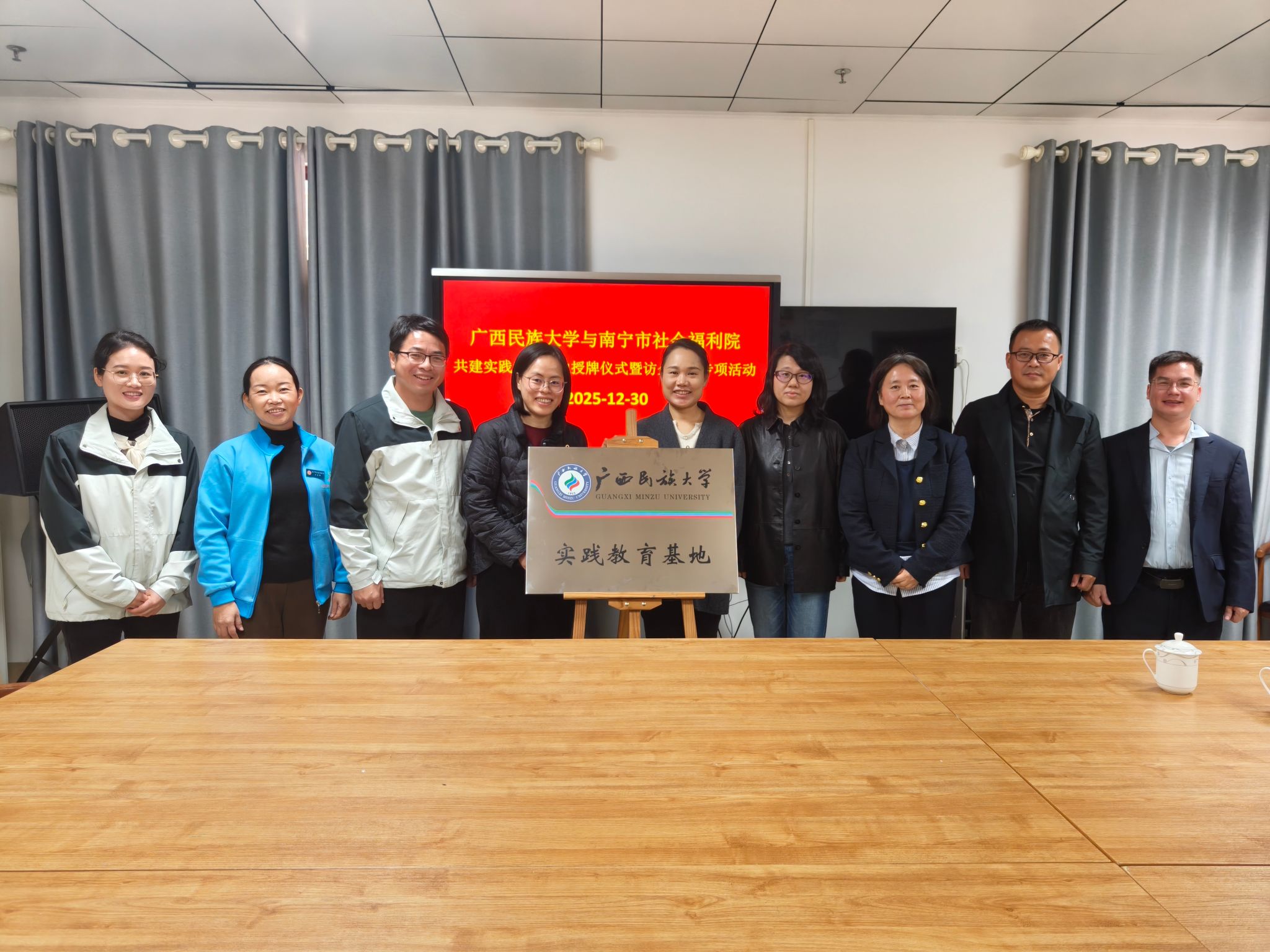 12月30日上午,民族学与社会学学院与南宁市社会福利院共建实践教育基地授牌仪式暨访企拓岗专项行动座谈会在南宁市社会福利院顺利举行。