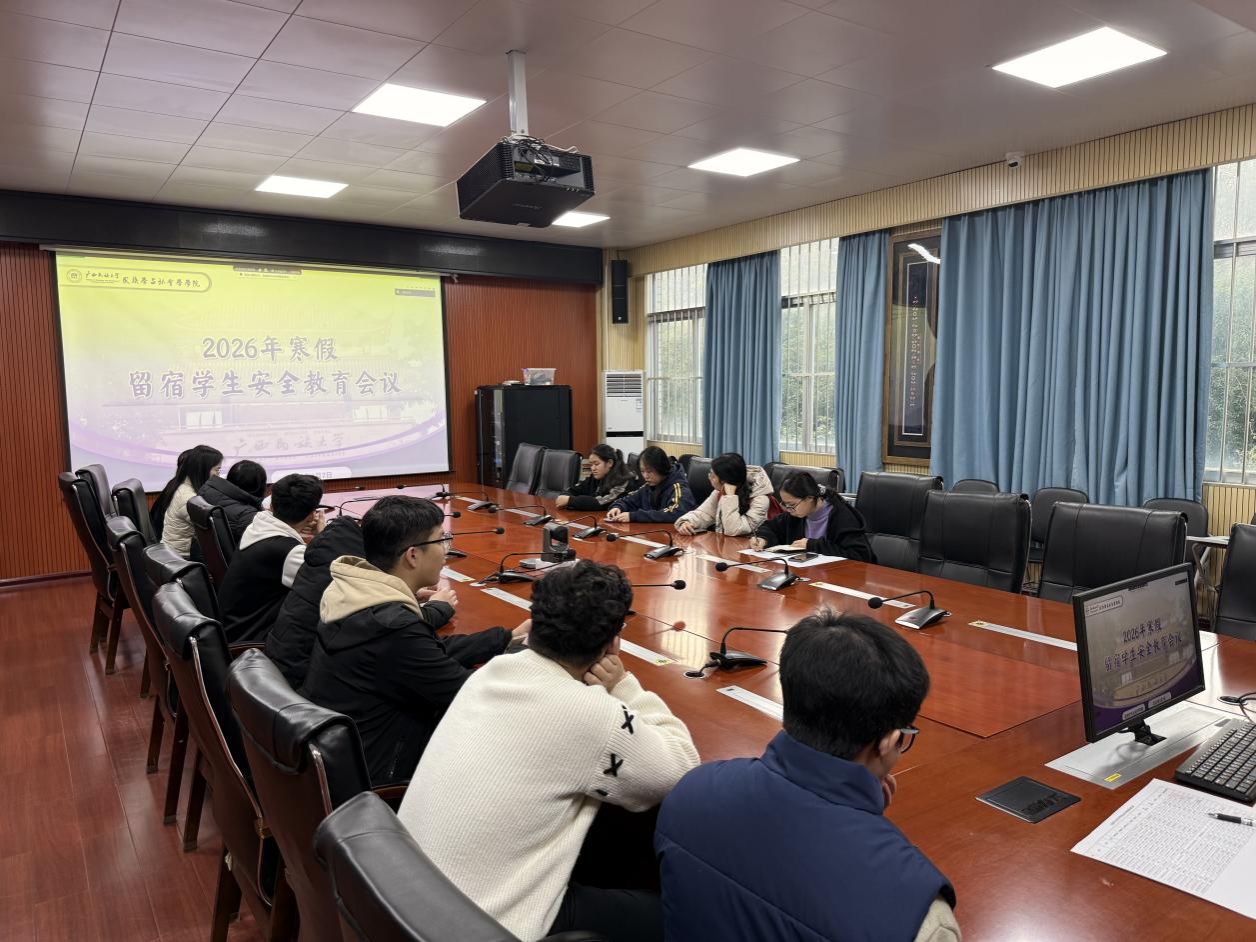 为保障寒假期间我院学子的去向安全,度过一个平安、文明、有序的假期,2026年1月7日下午,我院在基地楼103室召开寒假留宿学生安全教育会议。本次会议由辅导员王颖超主持,全体寒假留宿学生共同参与本次会议。