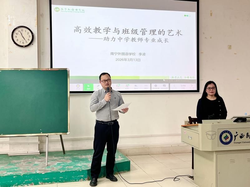 2026年3月13日下午,历史教育研习社第29期专题讲座在基地楼报告厅举行。本次讲座邀请了南宁外国语学校教务处主任、中学高级教师李凌作为主讲嘉宾,讲座由我院龙小峰教授主持,胡小安教授、部分历史学本科生与学科教学(历史)研究生参加讲座。